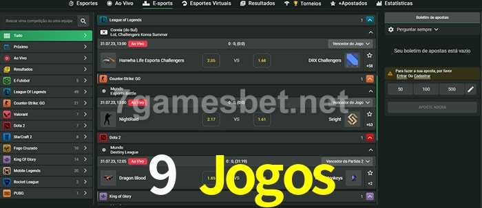 O 9 Jogos oferece uma grande seleção de opções de apostas em e-sports com probabilidades competitivas